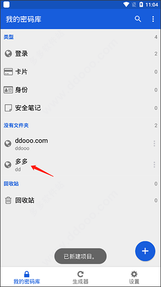 2. 登录后,主界面主要呈现为密码库、生成器和设置这三部分。