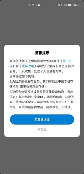 1、下载安装软件后进入,弹出温馨提示,点击同意并继续。