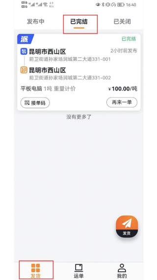 3、顶部有发布中、已完结、已关闭选项卡,当前在已完结页,展示一条已完结订单信息;