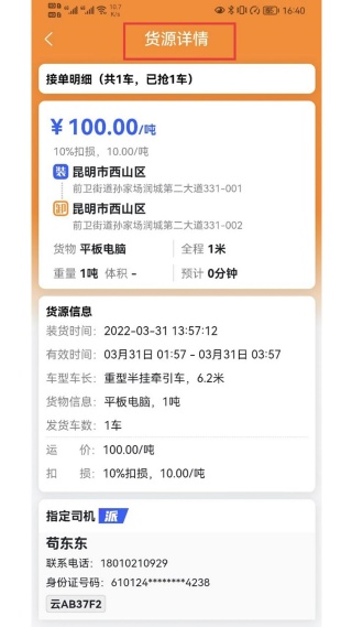 5、司机查阅匹配的订单,迅速即可与货主进行沟通和交流;
