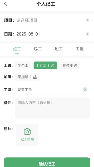 3、记工时板块的话,需要添加项目信息、时间、工价,并且同步上传照片。