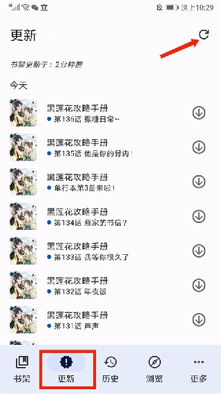 9. 在更新界面,点击右上角按钮能够刷新书架内容。