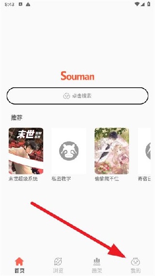 1. 于该网页下载Souman搜漫后,点击下方四大专栏中的【我的】。