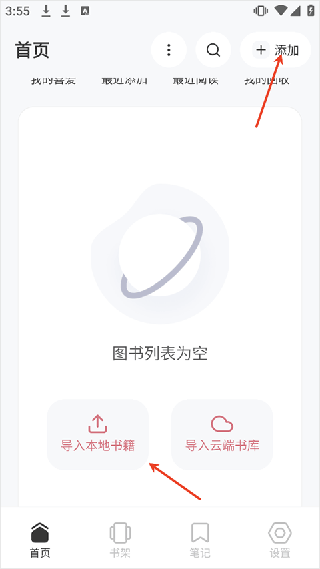 2. 导入书籍之时,点击右上角“+添加”按钮,首次使用,可在首页中间导入本地书籍。