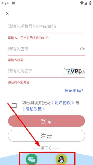 4、滑到登录界面的底部,还有第三方授权登录。