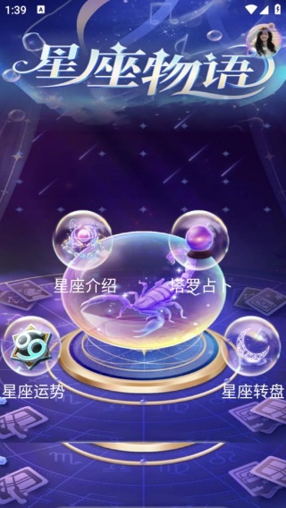 1、下载安装软件后进入,平台主界面有星座介绍,星座运势,塔罗占卜,星座转盘等内容。
