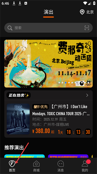 2、演出票务APP首页,展示演出板块,有搜索栏,呈现热卖和推荐演出,底部有首页等功能导航。