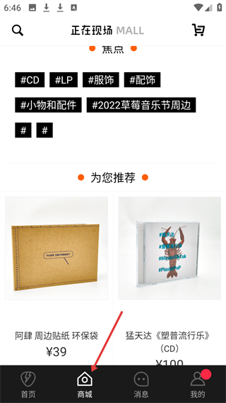 3、商城界面,即正在现场MALL,有分类标签,推荐周边商品,方便用户选购演出周边。