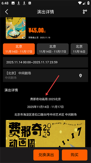 4、演出详情界面,展示费那奇动画周演出,标注票价、时间、地点,提供兑换和购买入口。
