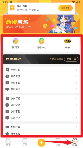 4、点击我的,既可以去进行漫画订阅,小说阅读记录,收藏内容查看。