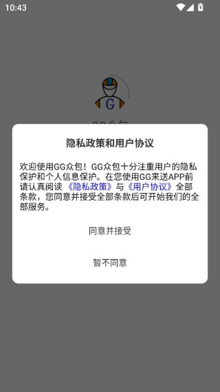 1、首先你需要在手机应用商店轻松下载安装GG众包app,点击同意并接受按钮。