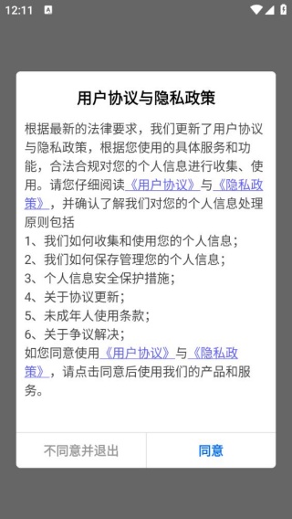 1、下载安装软件后打开,弹出用户协议与隐私政策,阅读后点击同意。