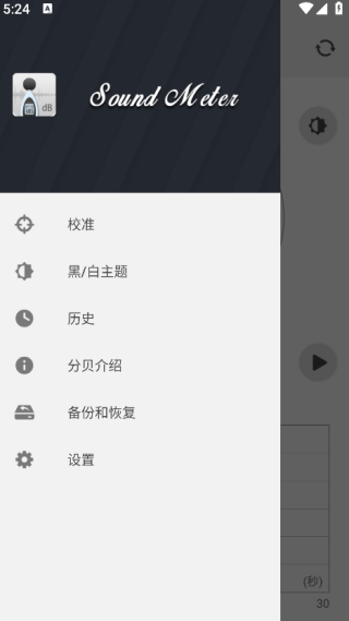 4. 点击‘设置’,即可看到保存音频文件、保持屏幕常亮、分贝警告等功能。