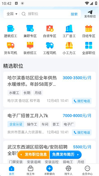 1、打开吉工家App,在首页根据自身需求选择“找工作”或“我要招人”等核心身份入口。