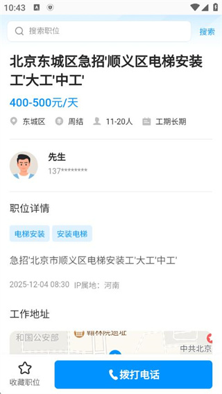 3、在岗位列表中点击进入详情页,查看详细要求和待遇,若合适可直接点击页面上的电话图标进行咨询。