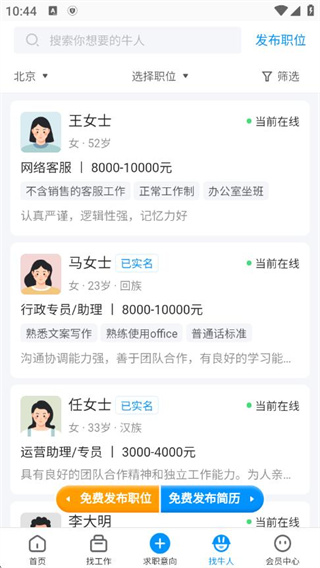 4、如果初始选择了“我要招人”身份,则可在主界面查看求职者简历(找牛人),或点击发布招聘。