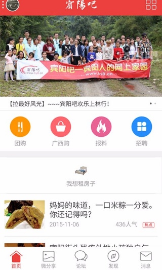 1、打开宾阳吧app进入到首页界面;