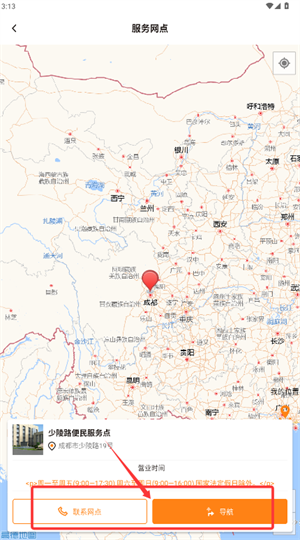 3、页面展示网点分布信息,支持直接联系或一键导航至目标地点。