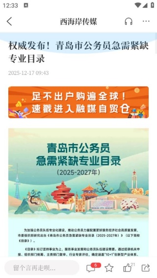 西海岸传媒app是一款面向手机用户的新闻客户端,由青岛电视台黄岛广电中心倾力推出。其专注于为用户推送西海岸地区的各类最新资讯,涵盖城市、文化、体育、教育、经济、时政以及党政等多个新闻版块。用户可自行订阅感兴趣的版块,并能对各版块中的每则新闻报道进行细致阅读。阅读过程中,支持收藏、分享及评论新闻,充分保障用户言论自由的民主权利。此外,该新闻阅读app还贴心为本地用户打造了服务平台,服务内容包含政务服务与生活服务,从人们日常需求出发,用户如需生活服务,在此即可查找相应项目,赶快下载体验吧。