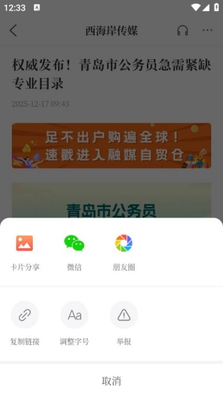 4、用户可直接分享优质新闻至微信好友及朋友圈;