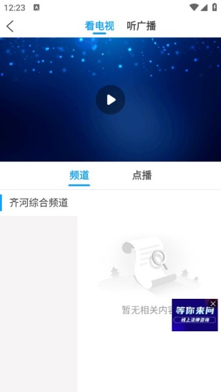 2、点击“视听”板块,看电视、听广播可随意切换,高效获取信息。