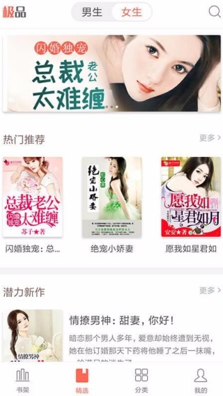 1、在精选板块,会有热门小说推荐,并且能够选择男生或女生小说类别。