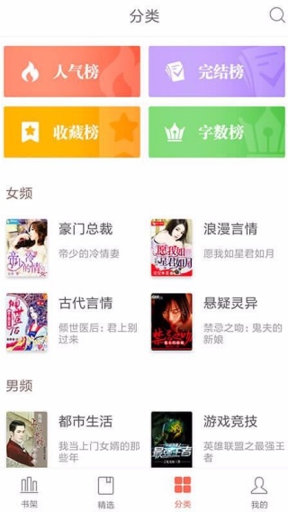 6、设有完结、人气、收藏、字数四大榜单分类,让你找小说更加便捷;