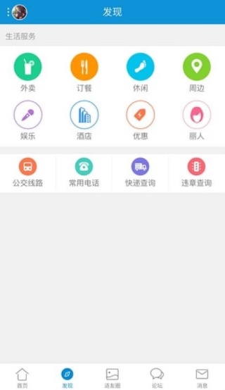 4、在发现页面选择服务类型,包含订餐、娱乐、周边查询等综合功能。