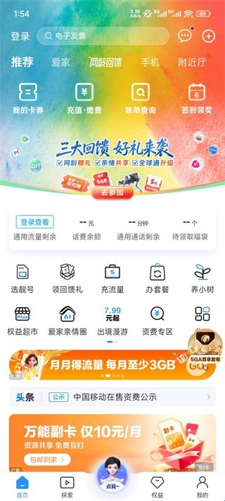 首页集成充值缴费、账单查询、家庭共享、国际漫游等核心功能,覆盖用户食住行娱全场景需求