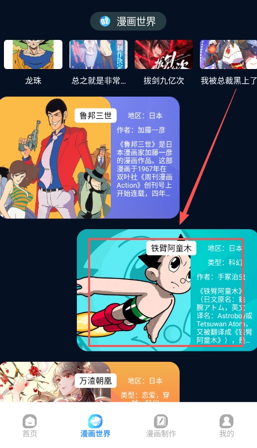 进入漫画世界页面后,就能浏览到龙珠、铁臂阿童木等各类漫画作品,便于你快速找到心仪内容,开启沉浸式阅读体验。