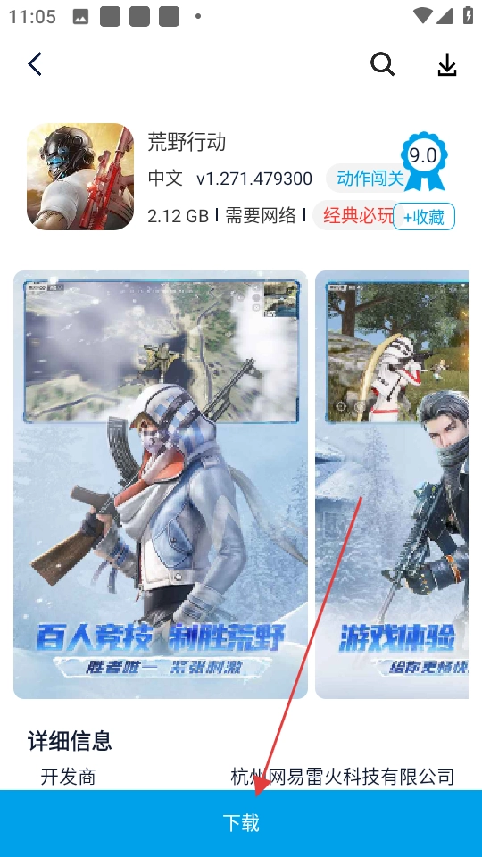 在搜索结果里,点击【荒野行动】的游戏条目,进入游戏详情页,查看游戏相关信息。