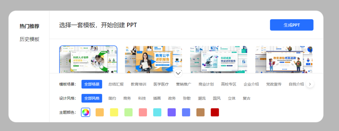 生成大纲后,点击底部“一键生成ppt”,选择ppt模版。