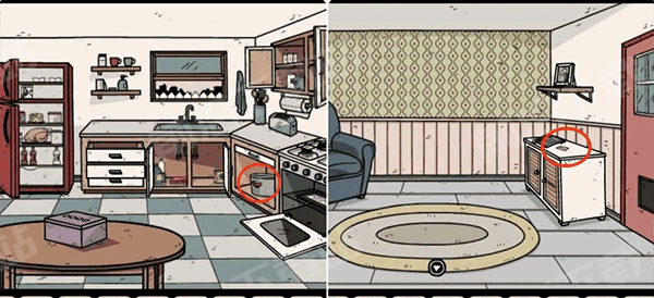 8、进入厨房搜索道具获得烧鸡、火柴和皮皮虾,灶台下方的两个柜子可以找到第三只收藏要素和饼干提示(饼干图案和顺序)。