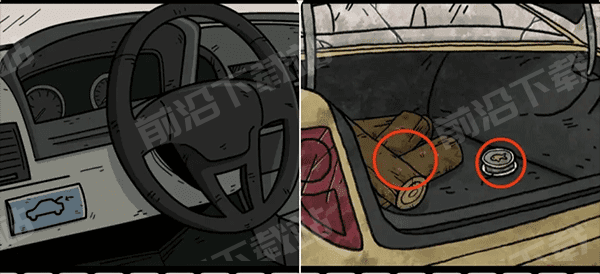 10、到车库用钥匙打开车门并打开后备箱,在副驾驶座位上有第四只收集要素,先根据车库工具墙上工具的形状打开后备箱里的盒子获得红钥匙,再切换到巴斯蒂安拿走后备箱里的木头和鱼线。