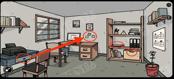 12、切换至卡丽莎来到二楼用红钥匙打开书房,先拿走书架上的A4纸和钥匙冰块,再根据抽屉以及电脑旁边的便签打开电脑。