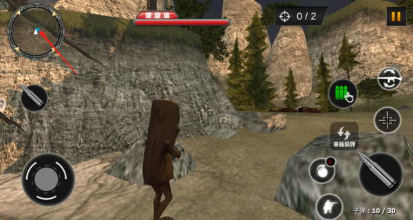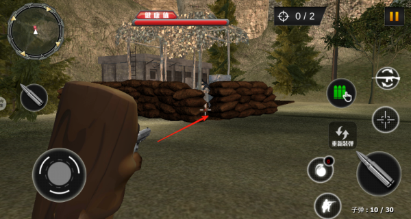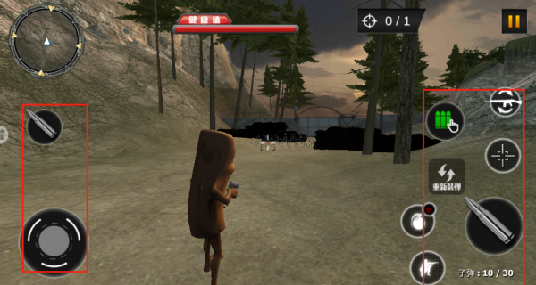 1、熟悉游戏基本操作,左下按钮控制角色移动,右下按钮用于射击、换装备及掩蔽等操作。