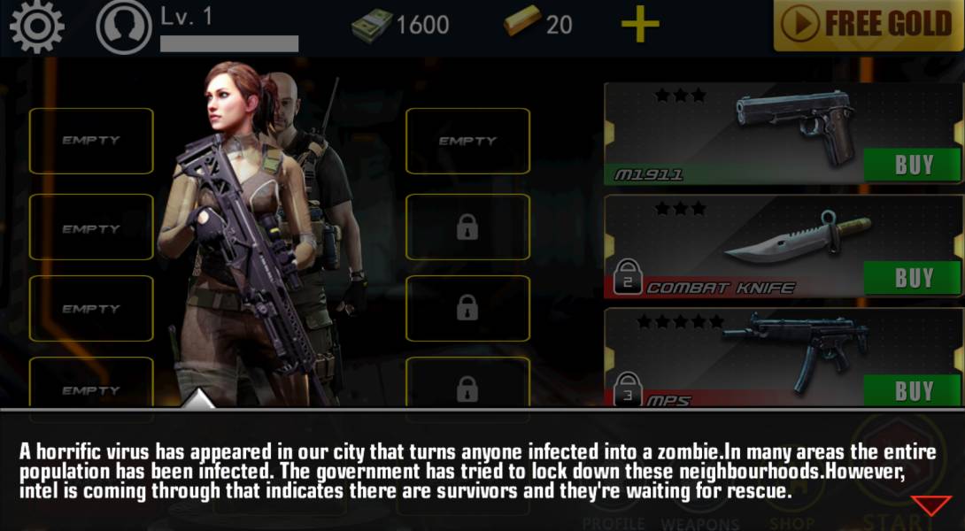 4.设计了多样化的武器和多达16种不同的枪械,游戏依照真实的数据模拟还原了冲锋枪、步枪、狙击枪和近战武器等,还要在武器界面中查看枪械的3D模型,玩家要选择自己喜欢的枪和数量庞大的僵尸进行战斗。