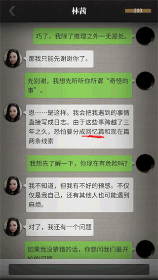 1、一开始,你会跟故事里的人聊天,第一个说话的就是来找你帮忙的那个人。她想把她的故事写出来,你得通过读故事、跟人聊天来挖线索,这样才能解开谜团。