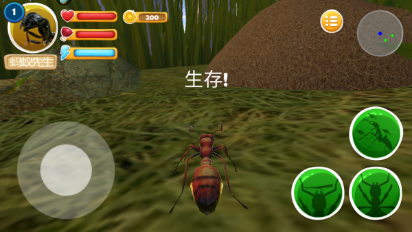 2.这部作品中打造出了以蚂蚁为主题的生存冒险手游,游戏中的玩家将要成为蚂蚁的一份子,除此之外还要在各式各样的复杂环境中充分的提升自己的生存技能,你要时时刻刻注意周边的障碍物和天敌。