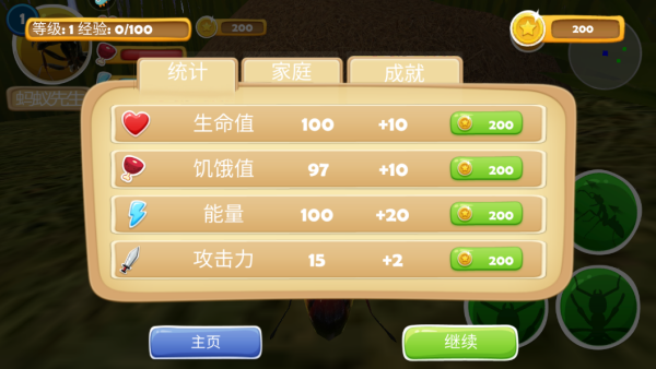 4.点击左上角能够查看角色当前状态,玩家需要不断提升蚂蚁的等级,关注健康值才能够长久生存下去!