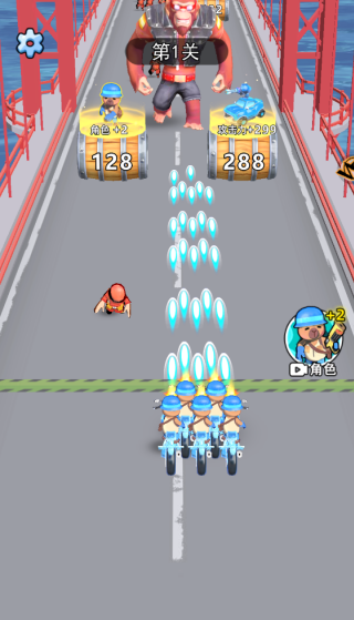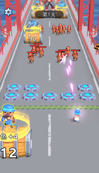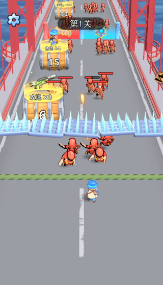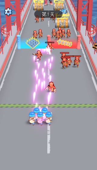 1、这带领小兵队伍在关卡中战斗,击破障碍,解锁并升级兵种和武器。