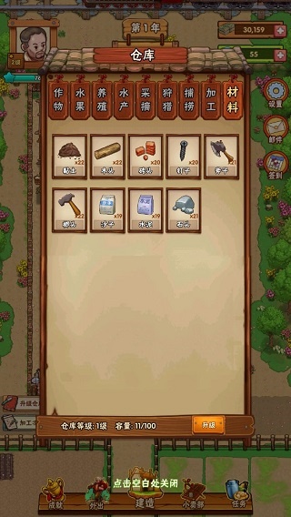 5.如图提示,需及时升级仓库容量以存储更多物资,运用经营策略打造理想农院,享受田园乐趣;