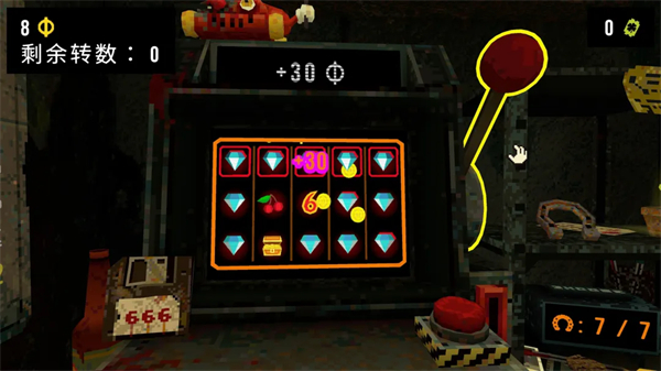生存的唯一途径是操作面前的老虎机获取金钱。通过摇动机器使相同图案排列成特定组合即可获得奖励,例如全屏同图案的"大满贯"可触发高额收益。