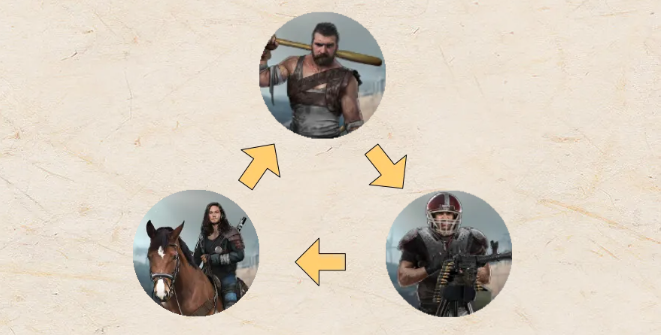三大兵种形成三角循环克制关系:步兵克制射手、射手克制骑手、骑手克制步兵。