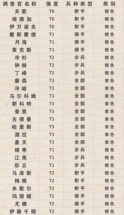 由于部分调查官(橙色)有带队兵种限制,建议普通玩家追求t3紫色调查官羁绊组合(紫色调查官无兵种限制),以及t2橙色调查官羁绊组合(使用免费的高级抽卡券,在高级卡池获取角色碎片)。