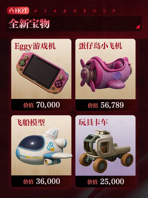 "eggy游戏机"、"飞船模型"、"蛋仔岛小飞机"和"玩具卡车"四款全新宝物上线,它们静静散落着,封存着无忧无虑的童年记忆——让蛋欣慰的是,小时候攒零花钱买的玩具,现在也能卖个好价钱了!