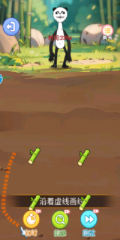3、我选择的是熊猫捞金玩法,时间有限,要顺着虚线绘制线条,把竹子捞上来。