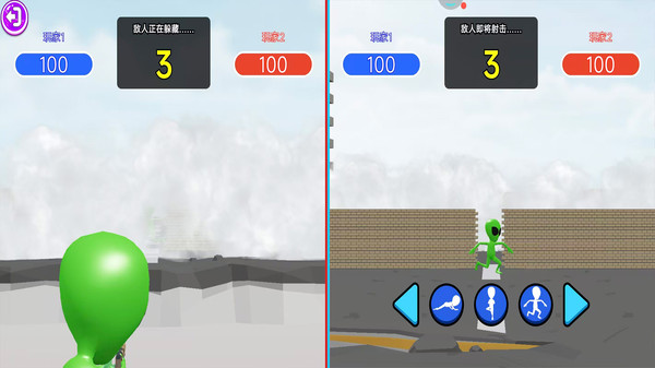1、双人于同屏战场展开热血乱斗,两名玩家各自操控角色,展开激烈的对射,比拼枪法。